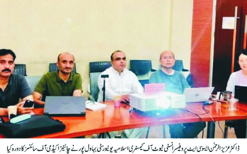 بہاول پور: ڈاکٹر عزیز الرحمن ایسو سی ایٹ پروفیسر انسٹی ٹیوٹ آف کیمسٹری اسلامیہ یونیورسٹی بہاول پور نے چائنیز اکیڈمی آف سائنسز کا دورہ کیا ۔ ممتاز چینی پروفیسر ڈاکٹر تاؤ ہی کی سربراہی میں نیشنل سینٹر فار نینو سائنس اینڈ ٹیکنالوجی میں اسلامیہ یونیورسٹی بہاولپور اوربہاؤالدین زکریا یونیورسٹی ملتان کی ریسرچ ٹیم مل کر کام کر رہی ہے۔اس پراجیکٹ کا مقصد توانائی اور ماحولیات کے موجودہ چیلنجز سے نمٹنے کے لیے اگلی نسل کو تیار کرنا ہے۔ پائیدار توانائی اور ماحولیاتی خطرات کے تدارک کے لئے فریم ورک کا قیام اور بنیادی میکانزم کی تیاری ہے تاکہ اعلیٰ کارکردگی والے مواد اور آلات کی تخلیق میں رہنمائی کی جاسکے۔
